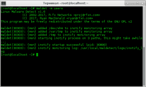 Maldet позволяет настроить мониторинг файлов в нужных администратору директориях в реальном времени. Свои параметры мониторинг берёт из конфигурационного файла, там необходимое можно найти в секции [ MONITORING OPTIONS ]. Для работы мониторинга необходимо установить inotify-tools (в CentOS можно взять из EPEL), без него мониторинг работать не будет…